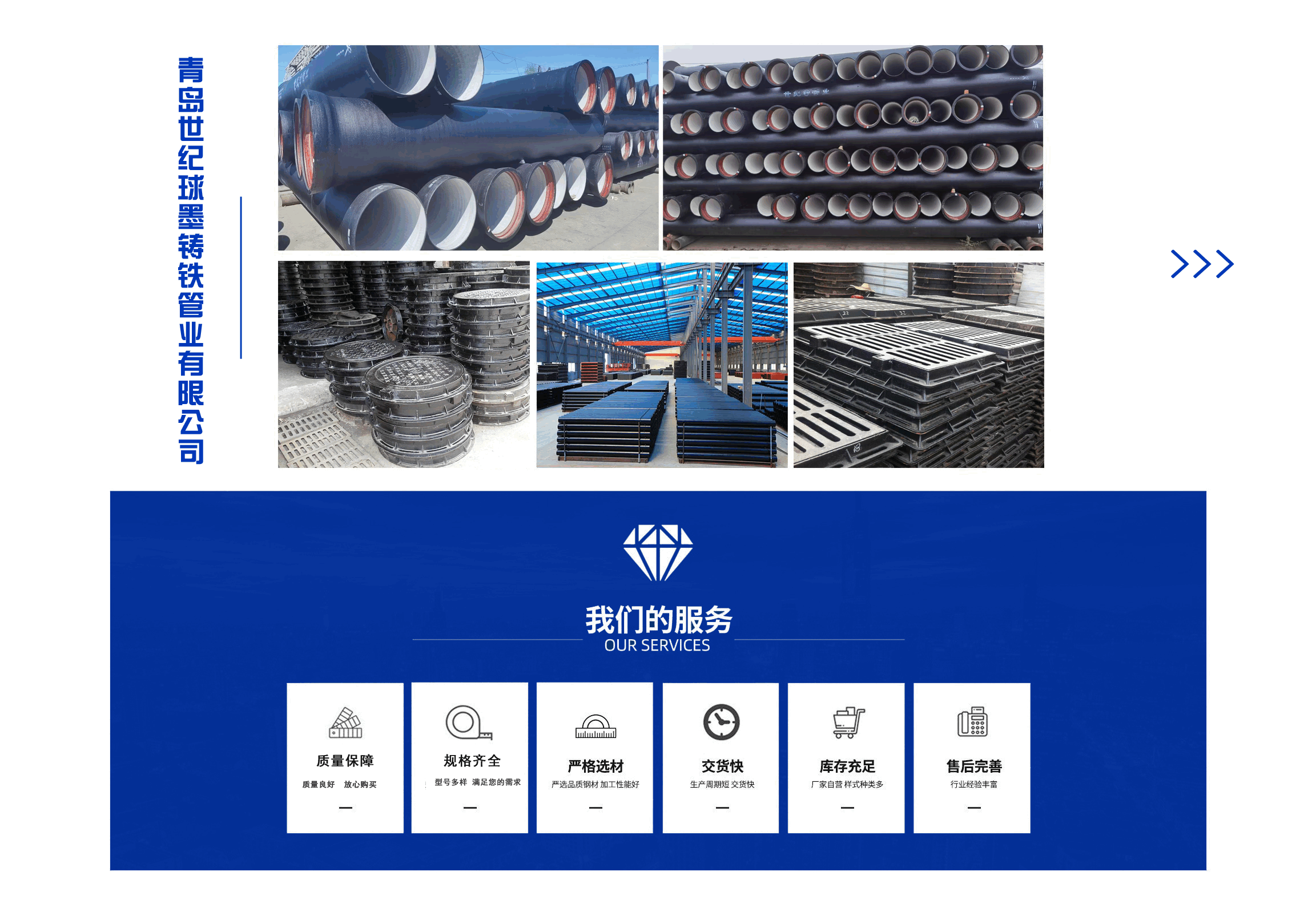 青島世紀球墨鑄鐵管業(yè)有限公司主營DN80mm~DN2600mm球墨鑄鐵管,給排水球墨鑄鐵管,球墨鑄鐵頂管,自錨式球墨鑄鐵管,球墨鑄鐵保溫管,球墨鑄鐵管件,柔性排水鑄鐵管,球墨鑄鐵井蓋,雨篦子等產(chǎn)品。我公司實力雄厚,常備萬噸庫存,貨源充足,規(guī)格齊全,發(fā)貨速度快!    青島世紀管業(yè)嚴格執(zhí)行“精益求精,增強顧客滿意;精益求進,實現(xiàn)持續(xù)發(fā)展”的質(zhì)量方針,建立起完善的售前咨詢、售中安裝、售后回訪服務體系,真誠地與用戶建立起長期密切合作關系。優(yōu)異的產(chǎn)品和良好服務受到廣大用戶的青睞,是您值得尊敬和信賴的合作伙伴。   青島世紀球墨鑄鐵管業(yè)始終堅持“誠信立業(yè),追求卓越,合作共贏,共同發(fā)展”,竭誠歡迎各界朋友來廠參觀指導,洽談業(yè)務。我們愿與您攜手共進,互惠雙贏,共創(chuàng)未來!...